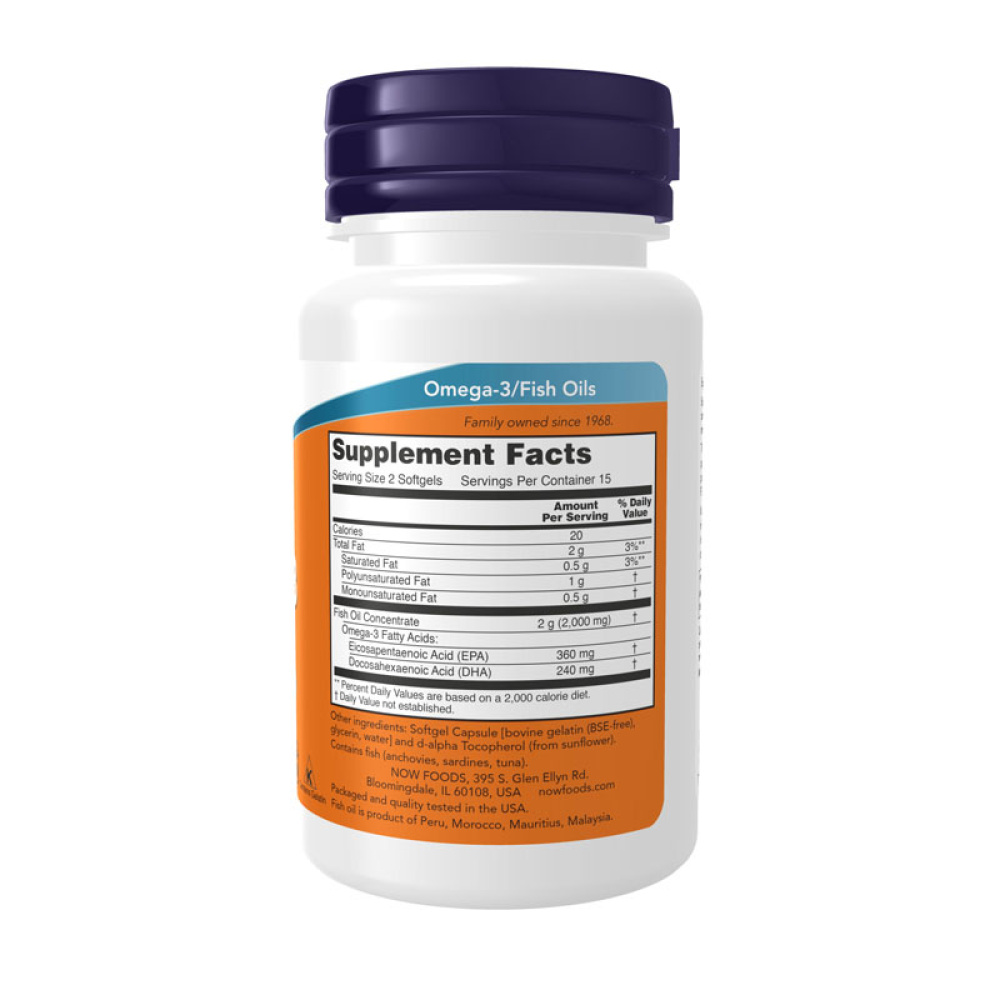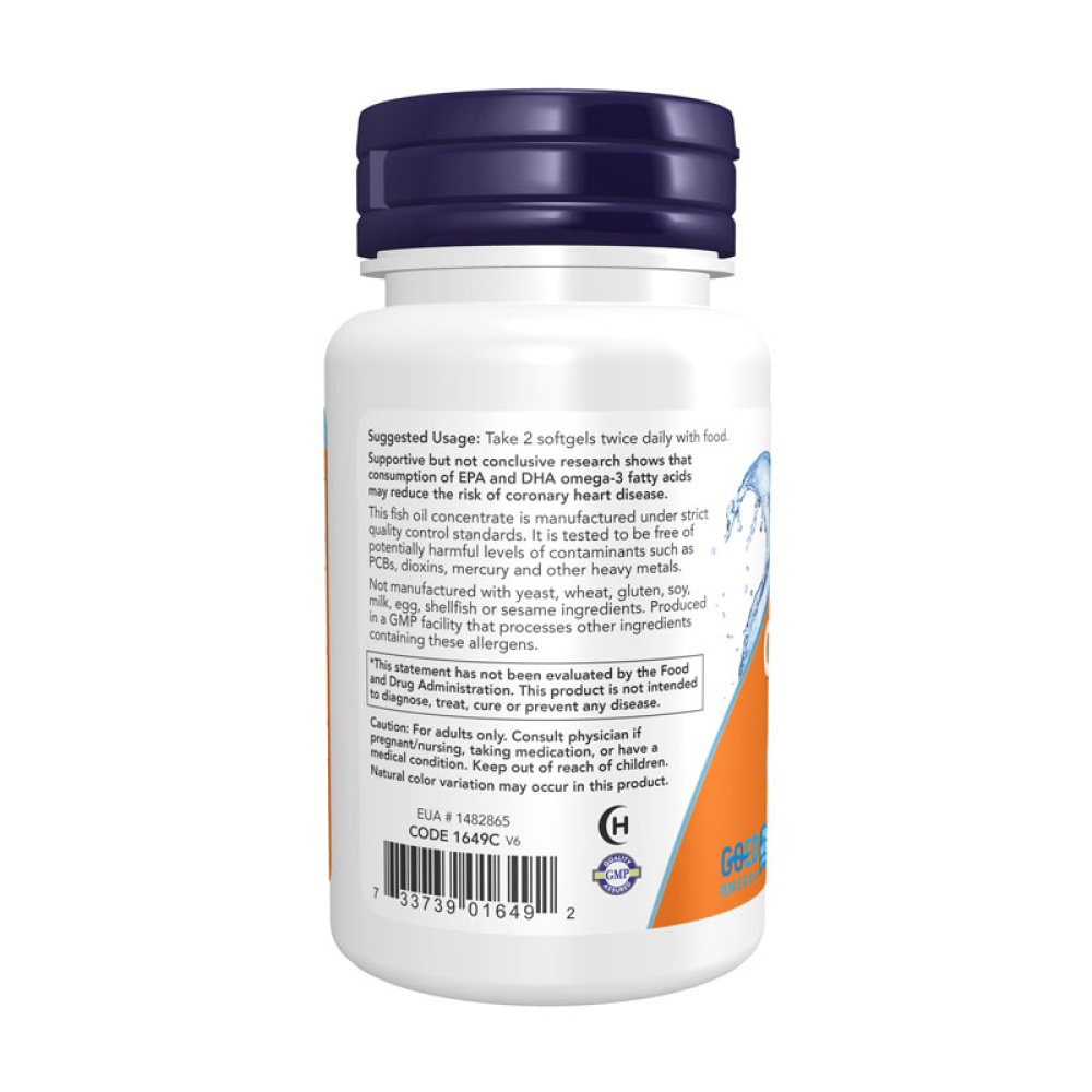Дієтична добавка Now® Omega-3 1000 мг містить поліненасичені жирні кислоти, отримані з дрібної глибоководної риби (анчоуси, сардини, тунець) і пройшли очищення на молекулярному рівні. Це означає що в компонентах дієтичної добавки не міститься шкідливих домішок, таких як ртуть, мікропластік і інші.
