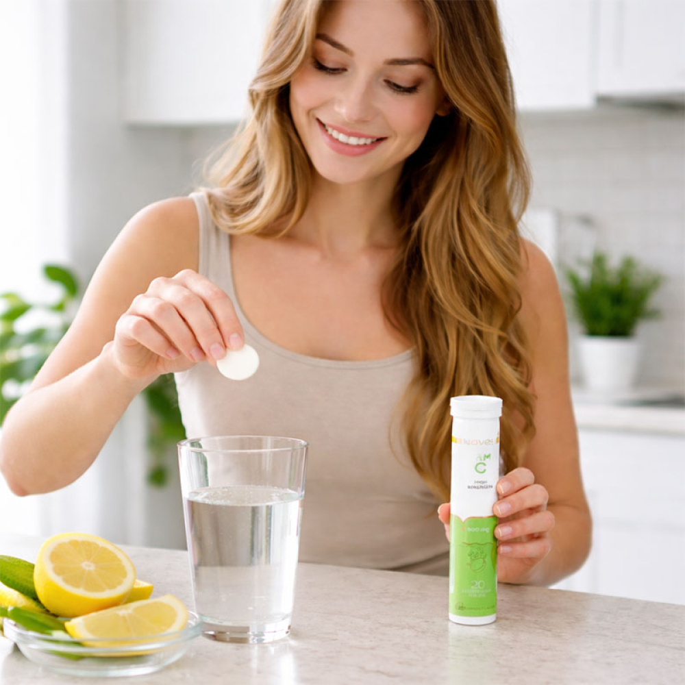 NOVEL Vitamin C — дієтична добавка у формі шипучих таблеток, що містить високу дозу вітаміну С (500 мг) для підтримки імунної системи та загального зміцнення організму.