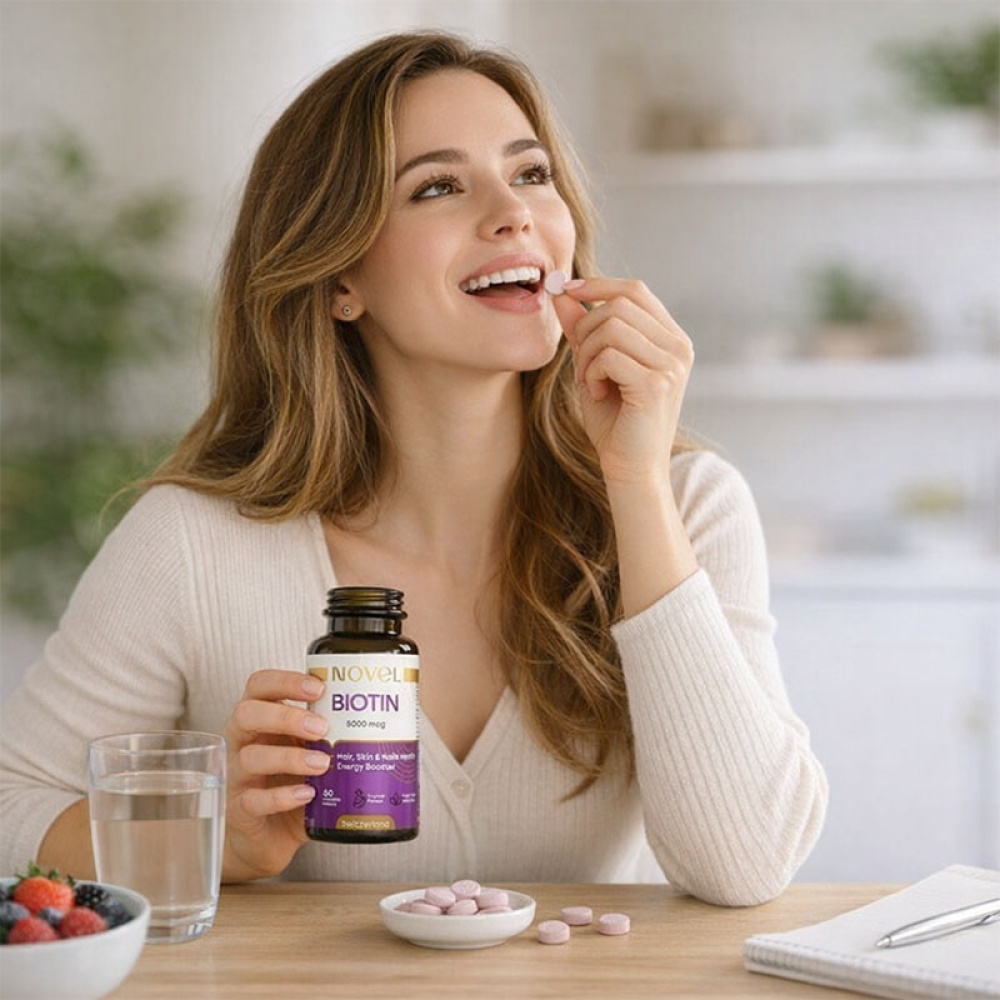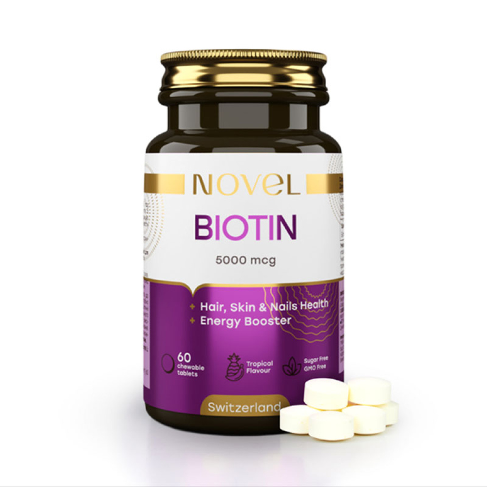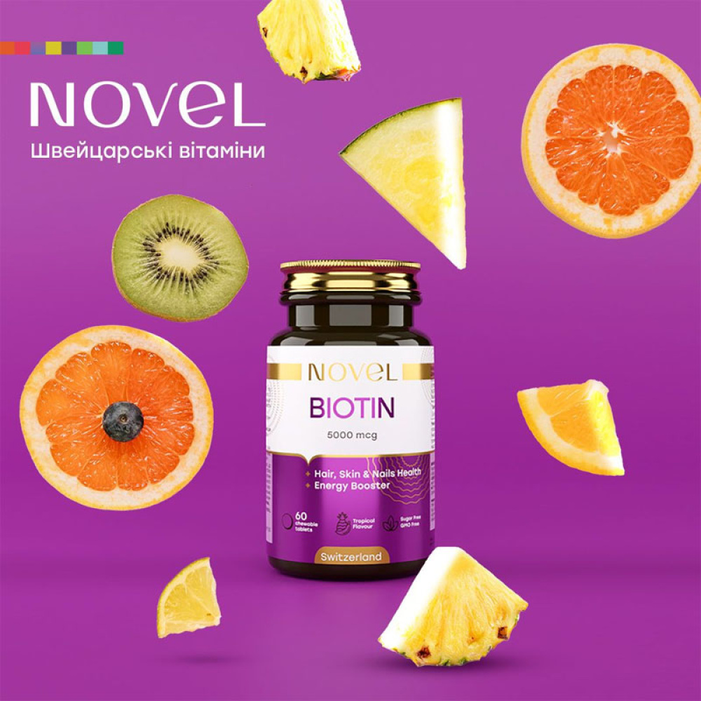 NOVEL БІОТИН 5000 мкг подарує твоїй волосині силу і блиск, покращує структуру та зовнішній вигляд, а також сприяє здоровому зростанню нігтів. Біотин допомагає знизити ламкість нігтьової пластини, сприяє зміцненню та зволоженню шкіри.