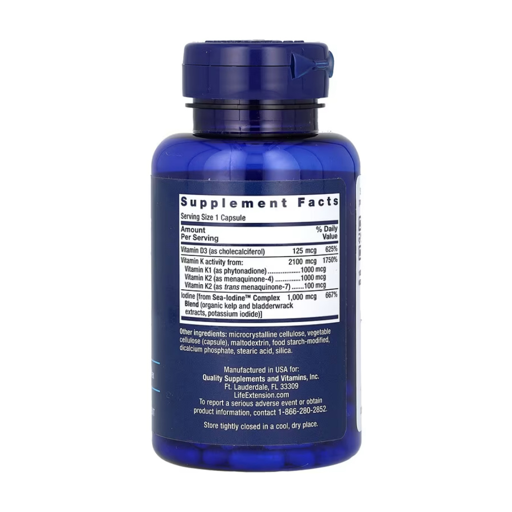 Цей засіб містить125 мкг (5000 МО) вітаміну D3, 2100 мкг вітаміну K та 1000 мкг йоду у вигляді зручної добавки для приймання один раз на день, щоб забезпечити підтримку здоров’я кісток, мозку, щитовидної залози та судин.