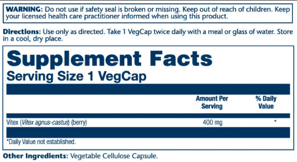 Solaray Vitex Berry Extract 400mg — це високоякісний екстракт плодів вітексу (Vitex agnus-castus), також відомого як свята верба або Авраамове дерево. Цей натуральний продукт використовують для підтримки здоров'я репродуктивної системи та гормонального балансу.