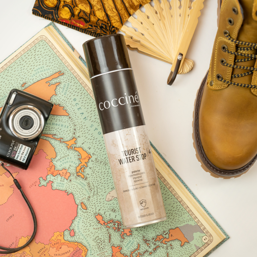 Водовідштовхувальний спрей Coccine Tourist Water Stop — це універсальний гідрофобний засіб для захисту від води, рідких забруднень, бруду та пилу виробів із будь-яких типів шкіри, замші, нубуку, текстилю (зокрема сучасних високотехнологічних матеріалів і мембран). Унікальна формула створює на поверхні оброблюваного матеріалу тонке захисне покриття й одночасно зберігає повітропроникні властивості, завдяки чому речі не відсировують. Вода не змочує поверхню, а відштовхується і стікає з обробленого виробу. Coccine Tourist Water Stop підходить для оброблення одягу, взуття, сумок, аксесуарів, плащових тканин, спортивного та туристичного спорядження, спецодягу тощо. Спосіб застосування: перед розпиленням очистити та висушити поверхню оброблюваного виробу, спробувати на непомітній ділянці (у разі надмірного використання засобу може виникнути світлий наліт, який можна видалити губкою або тканиною), рівномірно розпорошити на поверхню з відстані 25 см, тримаючи балончик вертикально, дати повністю висохнути. Максимальний час висихання 7 хвилин. Регулярне використання забезпечує чудовий захист від проникнення вологи та бруду. Переваги Coccine Tourist Water Stop: