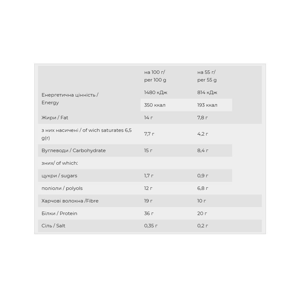 Склад: суміш молочних білків (концентрат сироваткового білку, концентрат молочного білку, ізолят сироваткового білку) 36,6%, шоколад молочний (олія кокосова, полідекстроза, сироватка молочна суха, підсолоджувачі (мальтитол, стевіол глікозиди зі стевії), молоко сухе знежирене, какао порошок зі зниженим вмістом жиру, емульгатор - соєвий лецетин, натуральний ароматизатор, сіль морська) 21%, гідролізат колагену, харчові волокна (полідекстроза, ізомальтоолігосахариди), олія кокосова, підсолоджувач - мальтитол, вологоутримуючий агент - гліцерин, какао крупка, натуральний ароматизатор, ароматизатор, емульгатор - соєвий лецетин, регулятор кислотності - кислота лимонна, сіль морська, антиоксидант – Вітамін Е (токоферолу ацетат), барвник натуральний – сік чорної моркви (антоціани). Може містити сліди горіхів, сої, яєць.