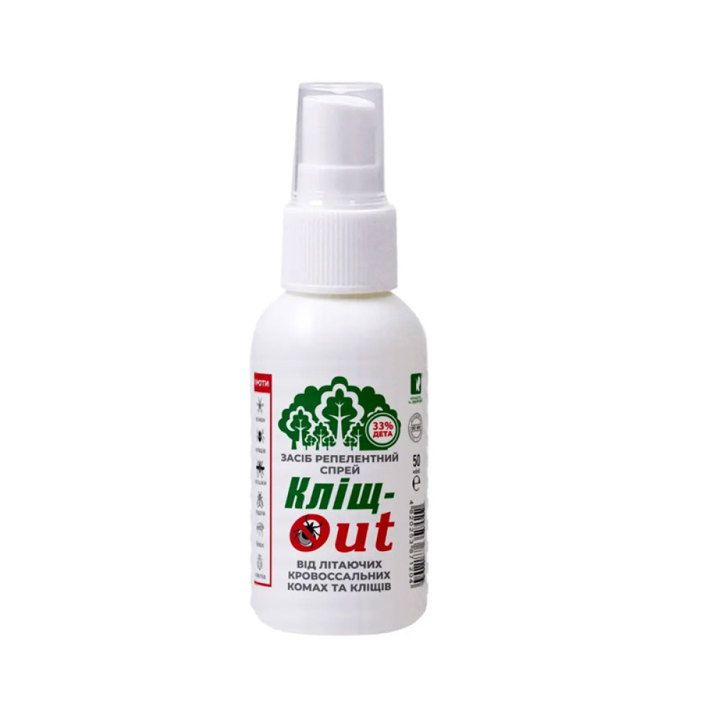 Кліщ-Оut – спрей захищає від комарів, кліщів, мошок, ґедзів, бліх, клопів та інших комах. Основний активний інгредієнт спрею (діетилтолуамід) органічного походження. Засіб посилено ефірними оліями цитронели, евкаліпту та гвоздики.