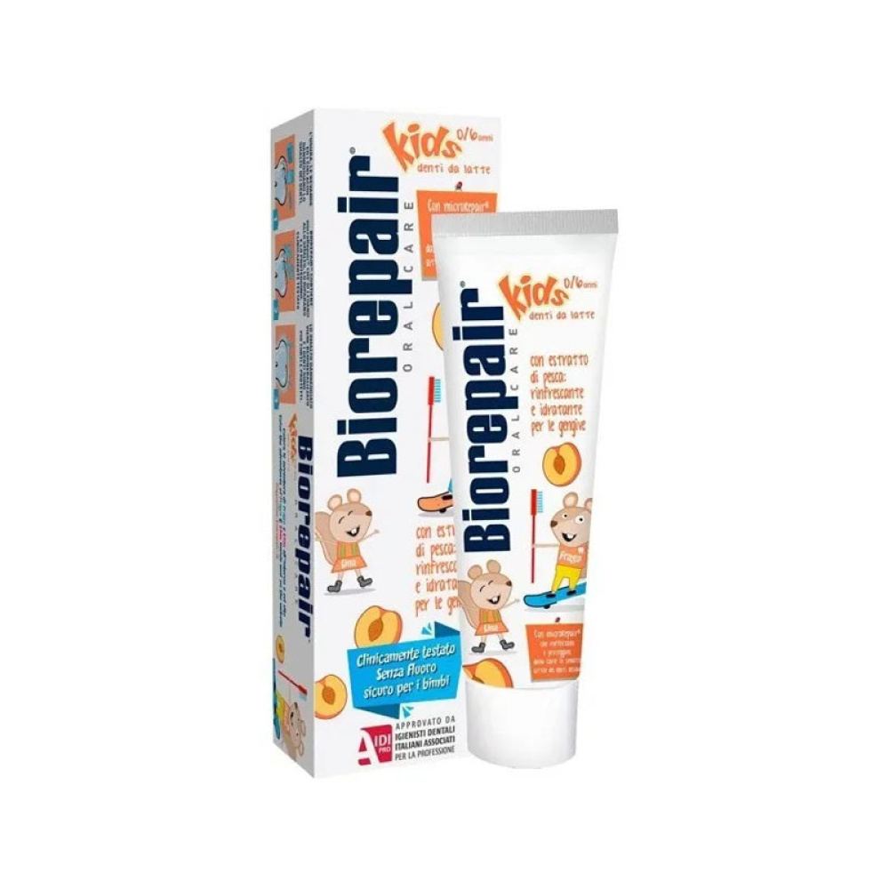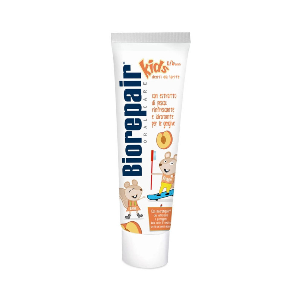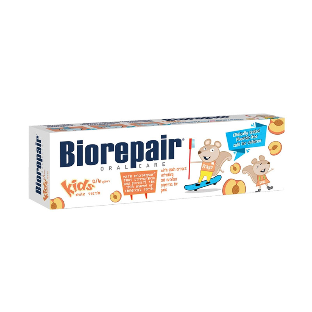 Паста Biorepair Kids з екстрактом персика живить і зміцнює ясна, освіжає ротову порожнину. Частинки microRepair сприяють правильному росту та розвитку молочних зубів, перешкоджають їх руйнуванню, появі карієсу та нальоту. Вони мають антибактеріальну властивість, усувають гіперчутливість зубів.