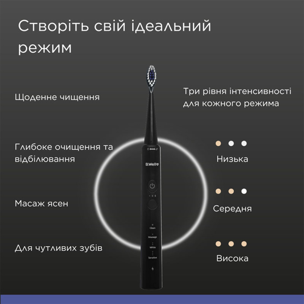 Електрична зубна щітка B.Well підійде кожному користувачеві завдяки індивідуальному налаштуванню та вибору режиму. Звукова зубна щітка MED-870 безпечна для пломб, мостів, імплантів, коронок та брекетів.